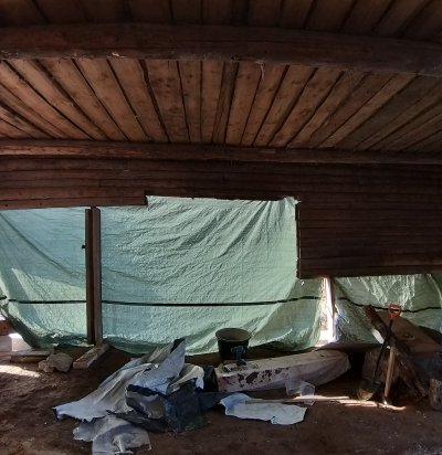 Maja otsa seinte üles ladumine fibo plokkidest ja vanade palkide eemaldamine.