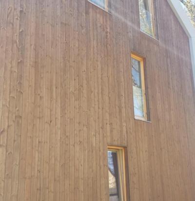 Laudfassaadi vanast värvist puhastus ja linaõlivärviga ülevärvimine.