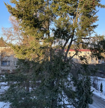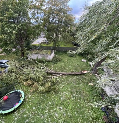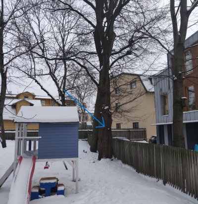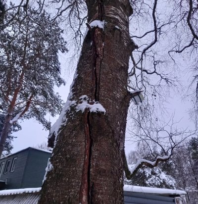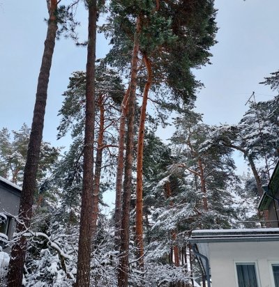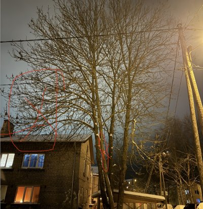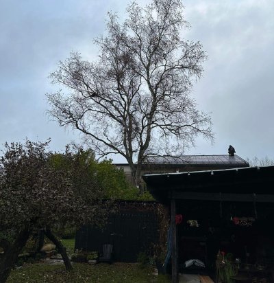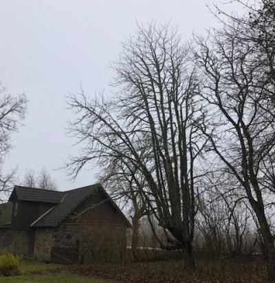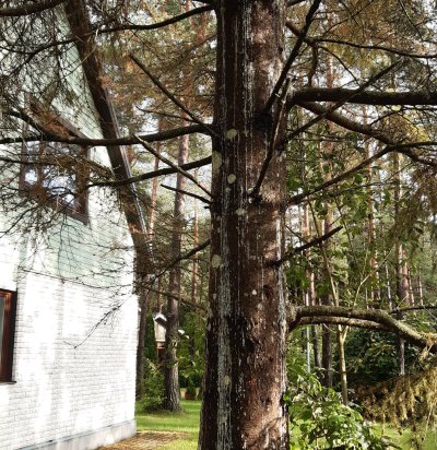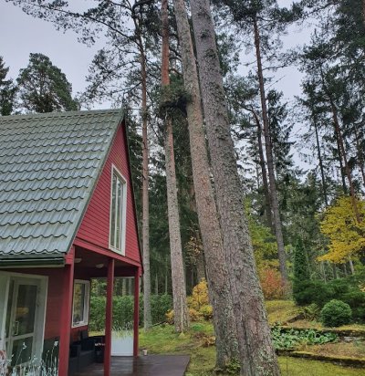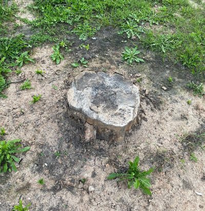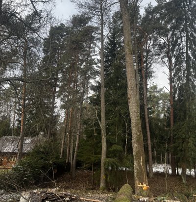 kolme männipuu langetamine, tükeldamine, äravedu, kännude väljafreesimine