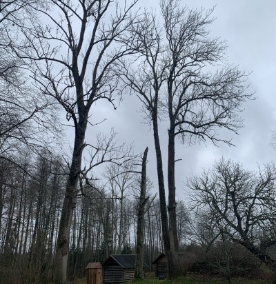 Arboristile,puude langetamine,2 suurt saare puud ja 1 väiksem kuivanud kuusk.