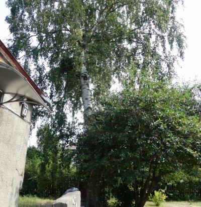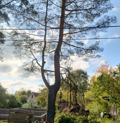 Ohtliku suure kasepuu langetamine Tallinnas Nõmmel väikeses aias