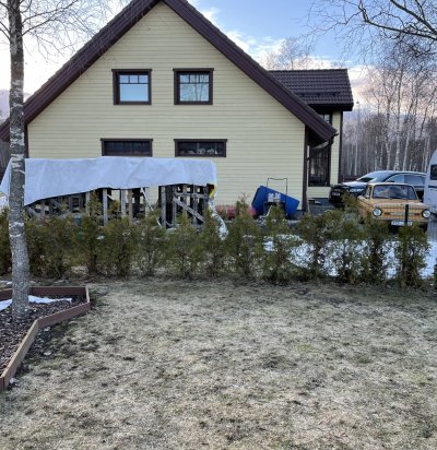 Puude langetamine, utiliseerimine ja kändude freesimine eramaja õuel.