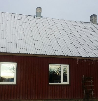 Tsementkiudplaadist katusekatte, aluskile, distantsliistude, harjaplekkide, korstnaplekkide, katuseluugi paigaldus.