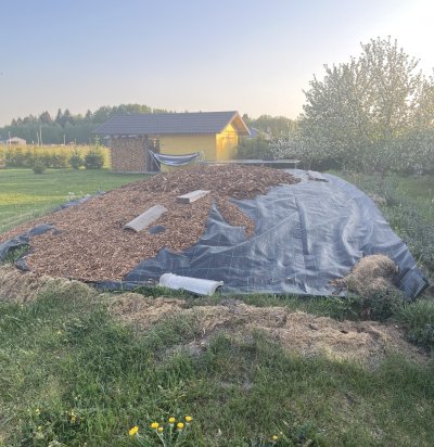 Alustatud peenra tekstiilivaiba ja multšiga katmine