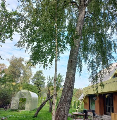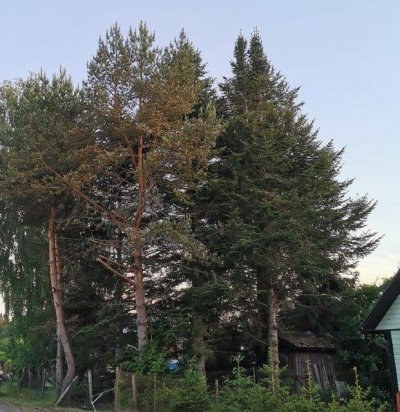 Ohtliku suure kasepuu langetamine Tallinnas Nõmmel väikeses aias