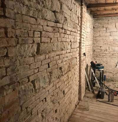 Korterisisene paekivi ja tellise puhastamine krohvijääkidest liivapritsiga