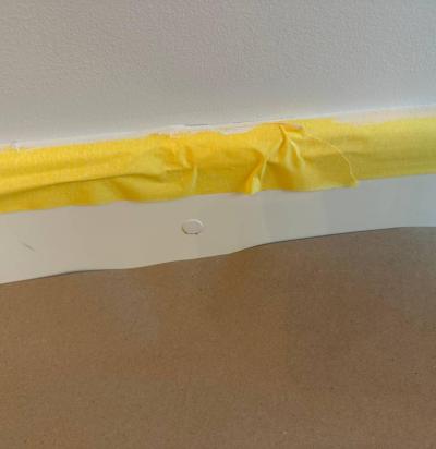 Sanding the small wooden plugs that cover the screws on the baseboard so they are smooth and painting it white so it looks nice and even