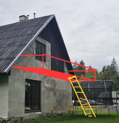 Rõdu metallist karkassi ehitus maja otsa, koos sirge trepiga.