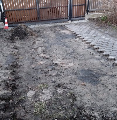 Tänavakivi maha, pinnase tõstmine u 10cm, uus kivi, mis kannatab autot, uue kivi paigaldus (ei ole ise kive ostnud) + töö käigus tehnoloogiad liivamurelaste vastu (sipelgad) +