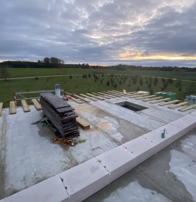 Lagedil eramaja bauroc seinte ladumine koos vahelae ja sarikate ning katuse paigaldusega