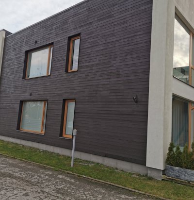 Kahekordse kortermaja seina laudade kinnitamine naeltega.