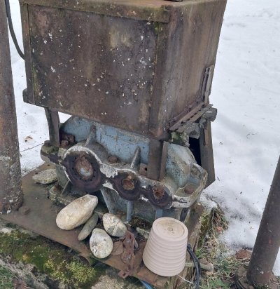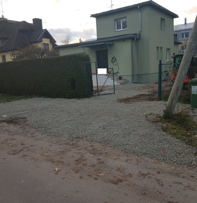 Värava ehitus aeda. Kolm telliskivist posti uue vundamendiga auto- ja jalg värava jaoks.