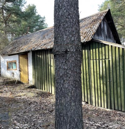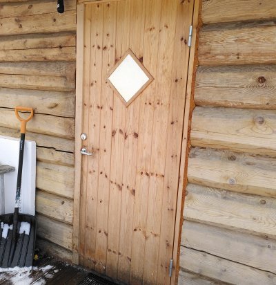 Palkmaja välisukse vahetus ukseava kohandamise ja viimistlusega.