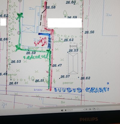 Vundamendi soojustamine (sinine osa), drenaaži (punane) ja sadevee torustiku ehitamine (roheline) ning tänavakivide paigaldus koos aluse ettevalmistamisega ja äärekivi paigadusega