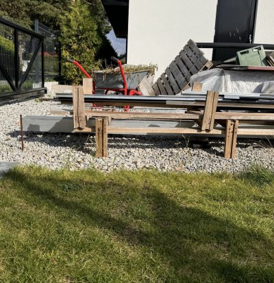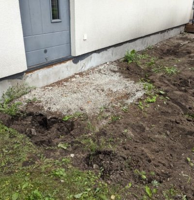 Pinnase ettevalmistus aiakuuri paigaldamiseks ja sillutise paigaldamine ümber elumaja