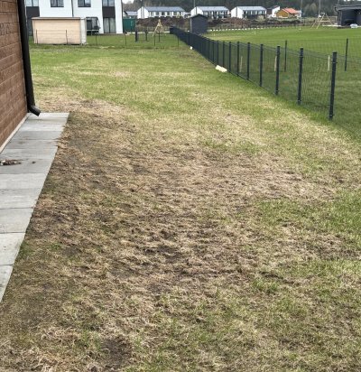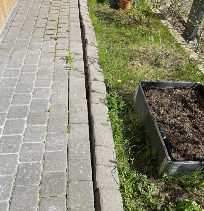 Выровнять завалившийся ряд тротуарной плитки на террасе. Дождями подмыло песок, старый бетонный бортик раскрошился. Нужно снять один-два ряда плитки, подсыпать песок, выровнять, уложить плитку ровно обратно и укрепить край цементом