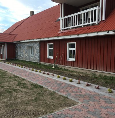 Murutee äärekivi paigaldus sokli ja muru vahele. Eramaja, Sakus.
