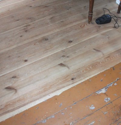 Vana laudpõranda lihvimine, osaline paikamine ja õlitamine.