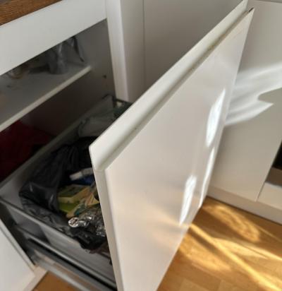Välja vajaks vahetamist või osaliselt asendamist 2 köögimööbli detaili (puitplaadist) , mis said veega kahjustatud.