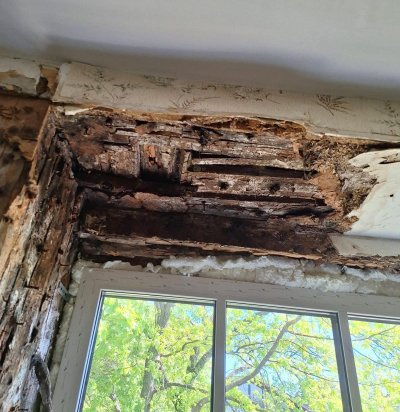 Aknaümbruse palkide vahetus ja pööninglae kandvate talade plommimine