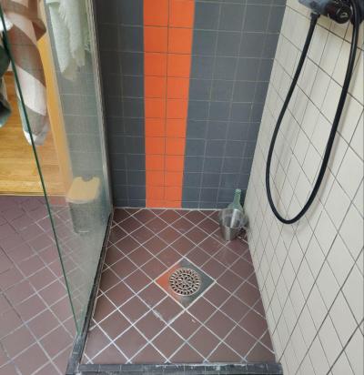 Duššinurga alt veeleke. Vesi imbub ühtlaselt duššinurga kogu ulatuses põrandale.