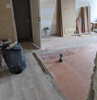 Köök/elutoa ja koridori põranda ühtlustamine, väikse kipsseina ehitamine