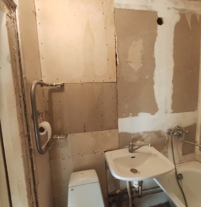 Vaja on plaatida vannitoas tualettpoti tagune ala. (Pärast toru vahetust). Parandada vannitoa uks.