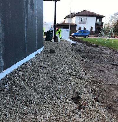 Vundamendi soojustamine (sinine osa), drenaaži (punane) ja sadevee torustiku ehitamine (roheline) ning tänavakivide paigaldus koos aluse ettevalmistamisega ja äärekivi paigadusega