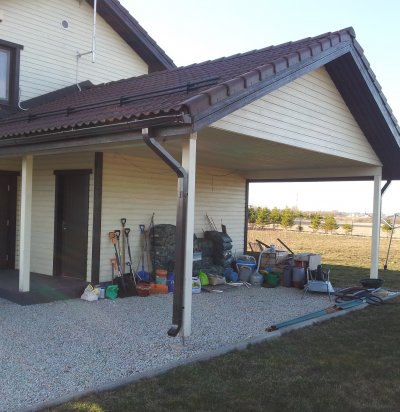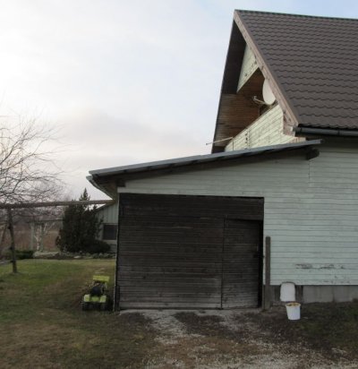 Puidust autode varjualune ja majale puidust trepp piiretega