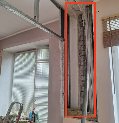 Seina lammutus, tugi palkide plommimine, uue seina ehitamine.