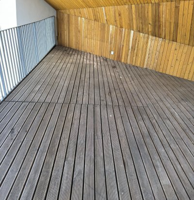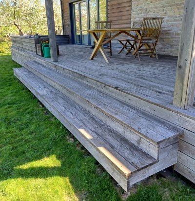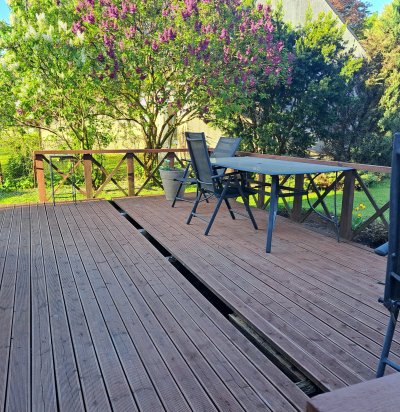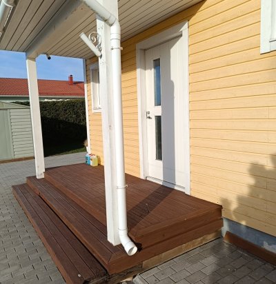 Terrassi ja puidust pergola/varjualuse ehitus + vertikaalsed puitribid fassaadile