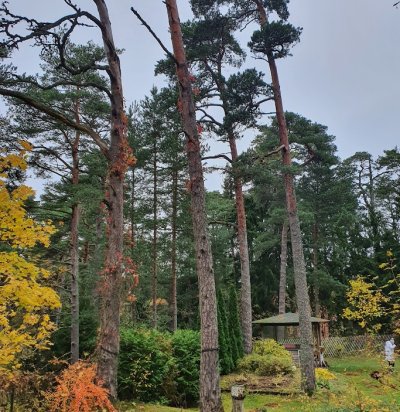 kolme männipuu langetamine, tükeldamine, äravedu, kännude väljafreesimine