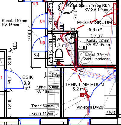Kahe väikse pesuruumi seinte ja lagede ehitus
