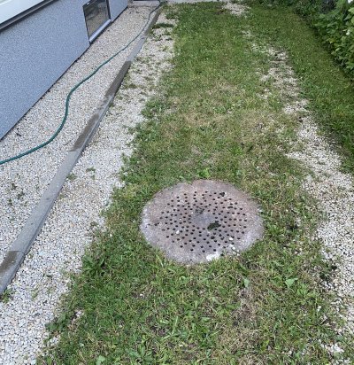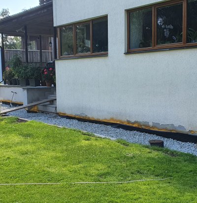 Murutee äärekivi paigaldus sokli ja muru vahele. Eramaja, Sakus.