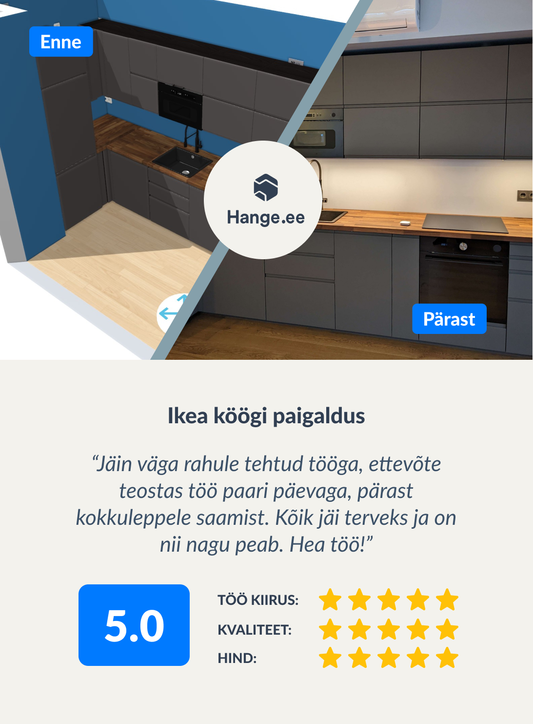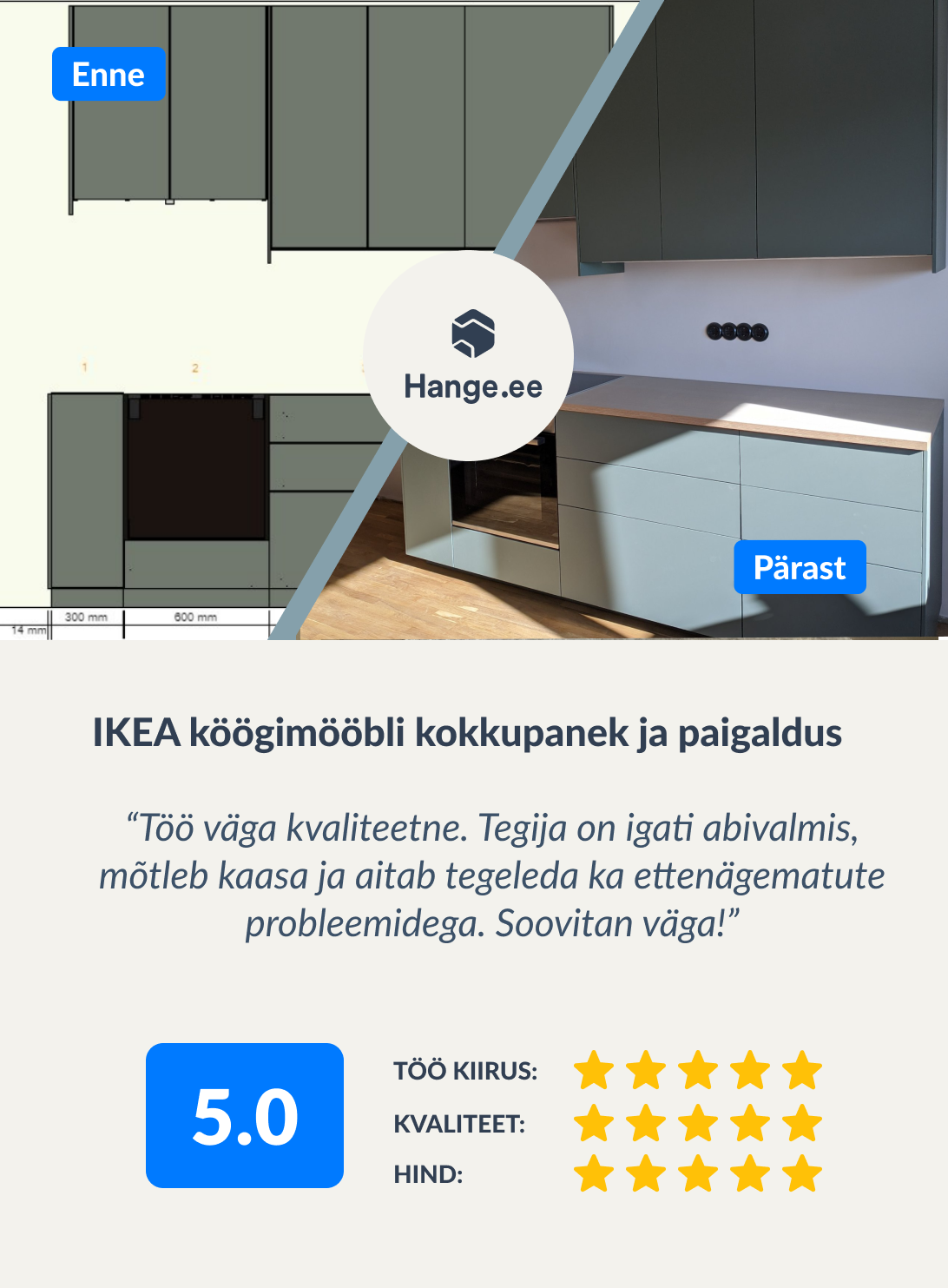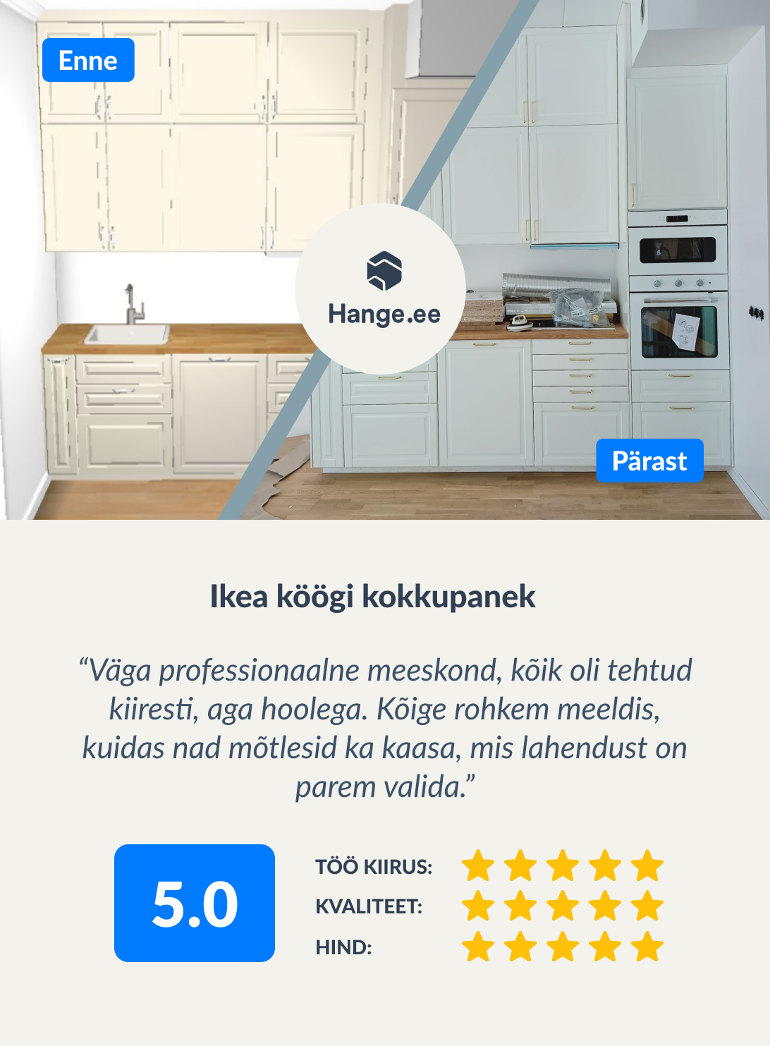 Hange.ee keskkonna abil leiad mugavalt mööbli kokkupaneku ja/või paigaldusteenuse ettevõtte. Sinu tingimustel.